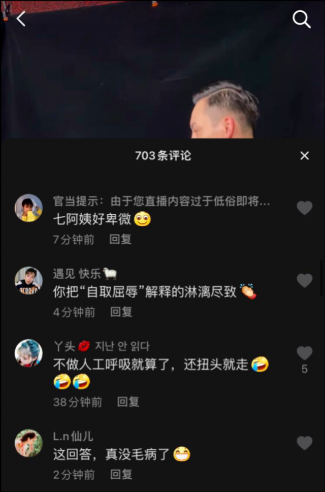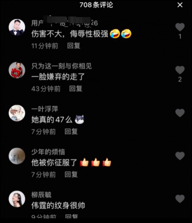 不少網友被柒阿姨和陳偉霆視頻逗樂,紛紛評論表示:“柒阿姨好卑微。”“你把自取其辱解釋得淋漓盡致。”“不做人工呼吸就算了,還扭頭就走。”“傷害不大,侮辱性極強。”
