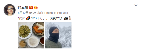 8月12日高云翔晒出了自己的早餐与一张在雪中的闭眼自拍,并写道:1239天……该到站了。高云翔这番话,再度引发热议。