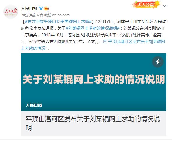 12月17日,河南平顶山市湛河区人民政府办公室发布通报,关于刘某锟网上求助的情况说明:刘某锟父亲刘某刚被打一事属实。2018年10月,湛河区人民法院以寻衅滋事罪分别判处徐某伟、赵某生、程某祥等人有期徒刑8年至5年。全文↓↓?