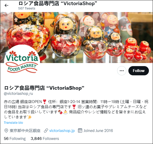 根據這家店鋪的推特賬號“俄羅斯食品專賣店‘VictoriaShop’(ロシア食品専門‘VictoriaShop’)簡介,“紅場”就是壹家俄羅斯食品專賣店,“主要銷售前蘇聯的點心和優質奶酪等食品”。