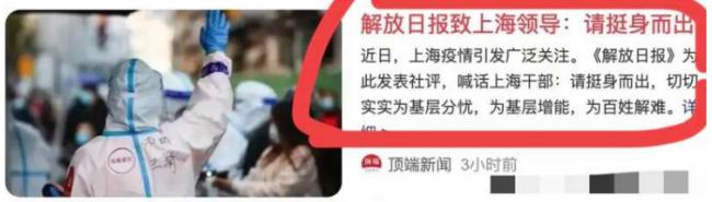 【解放日报致上海领导:请挺身而出】连日来,上海疫情牵动人心。这段时间,许多上海市民的生活遇到了这样那样的困难,比如买菜难、买菜贵、看病难、资源分配不合理等等,不少市民对防控工作提出了建议和批评。