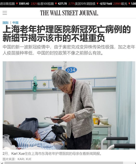 《华尔街日报》(The Wall Street Journal)对东海老年护理医院疫情的报道更全面地揭示了这座中国金融之都正遭受的苦难。截至4月6日,仅东海老年护理医院就有至少40名住院人员死亡。根据十几名患者家属和医务人员的描述、微信消息和医院文件,在这些死亡事件发生前,这家护理医院暴发了疫情,几百名患者和医院员工染病。