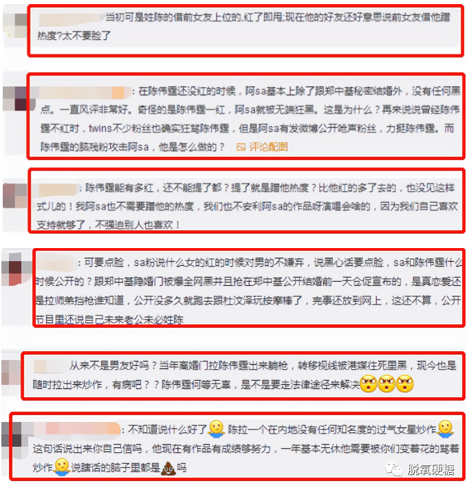 陳偉霆的粉絲和阿SA的粉絲還在網友互懟過,基本上就是女方粉絲覺得男方在借女方上位,男方粉絲表示女方是拉男方出來擋槍的。