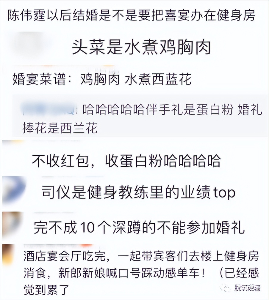 戀情被曝光後還有網友調侃了下超模和健身達人的婚禮菜單,估計是水煮雞胸肉和西藍花,伴手禮是蛋白粉。