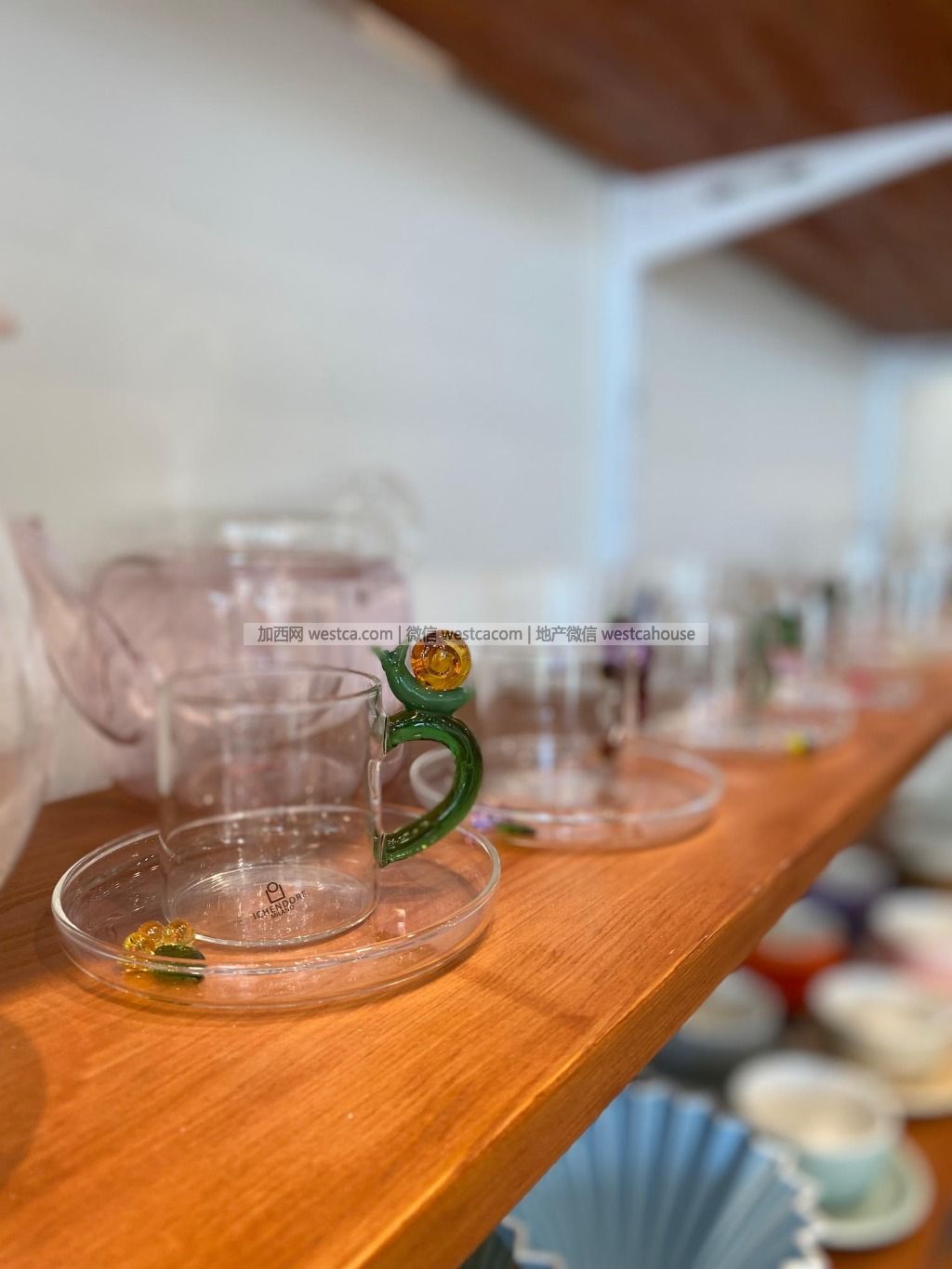 玻璃材質的日式茶具質地透明、光澤奪目,茶杯把手上小蝸牛、蝴蝶、瓢蟲等造型精致可愛,還有配套杯碟,真是令人愛不釋手。