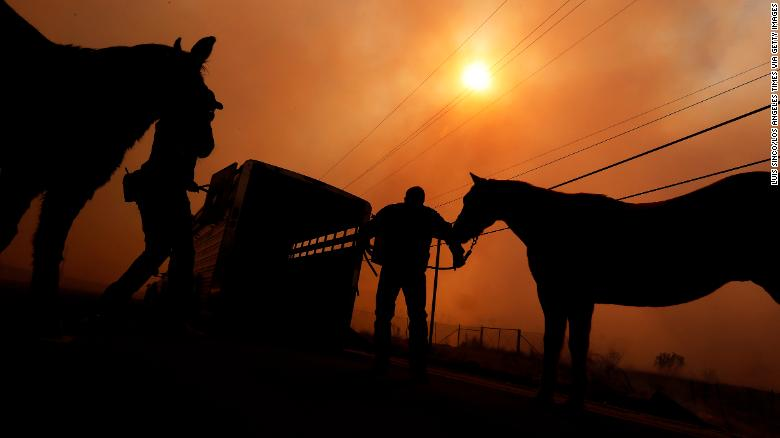 浓烟从山间涌出,火花在空中炸开,大火不断地向马里布牧场逼近。