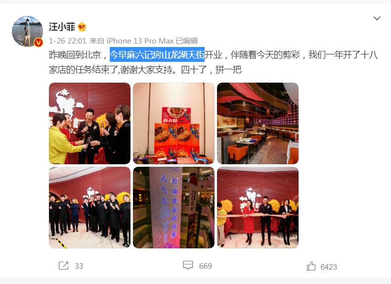 " 今早麻六記房山龍湖天街開業,伴隨著今天的剪彩,我們壹年開了拾八家店的任務結束了。" 今年 1 月 26 日,汪小菲發微博稱," 肆拾了,拼壹把。"