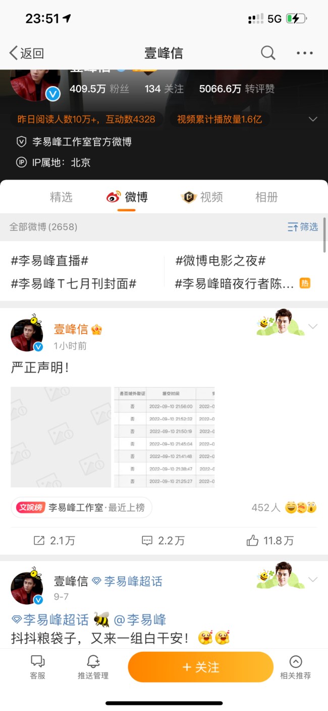 22:37 李易峰及李易峰工作室“壹峰信”發布聲明;