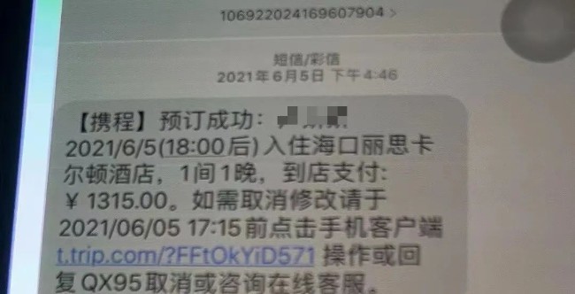 爆料者不但曬出了2021年6月在海口訂酒店的短信截圖。