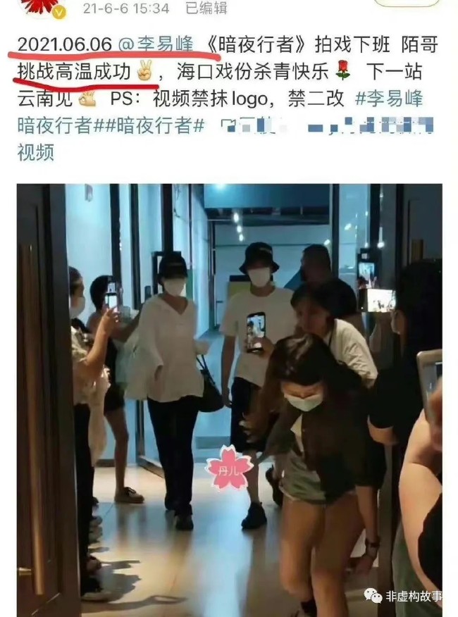 就在李易峰和壹女子在酒店約會並看了不雅內容的2021年6月6日,粉絲在接他拍戲下班。