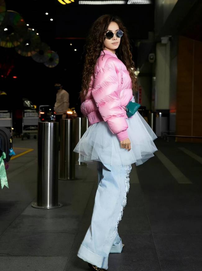 同样的红配绿,在这套专门展示的穿搭上也存在,粉色的棉服外套加墨绿色的小包包,不过相比较日常穿的大红大绿,粉色看上去顺眼多了。但这套衣服,也是同样的穿搭翻车,不少网友评论造型师拉出来打,直指蔡依林现在的穿搭就像时尚地狱。