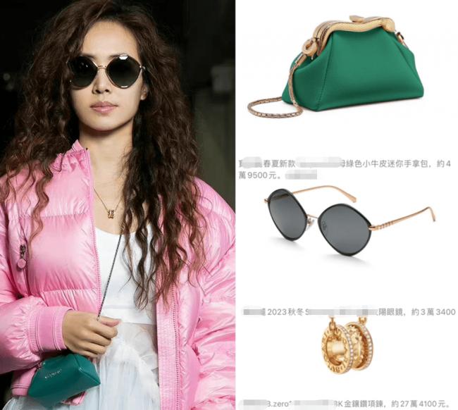 身上的祖母绿迷你手拿包,是某某丽春夏新款,价值高达49000元。脖子上带的类似转运珠的项链,也是同品牌的新款,价值274100元,戴的墨镜是同品牌秋冬款,大约要33400元。光是这一套额外的小首饰搭配,价值就高达35万元。