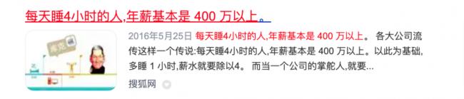 江湖上也流传着许多“成功人士不需要睡觉”的传说。从拿破仑、雍正皇帝、彼得大帝、撒切尔夫人,到一众科技新贵,再到“每天睡 4 小时的人,年薪基本是 400 万”的职场毒鸡汤……