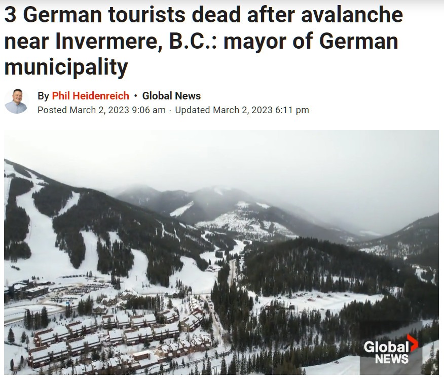今年已發生多起雪崩事件,3月1日中午左右,BC省內陸地區發生致命雪崩,造成3人死亡,4人重傷。