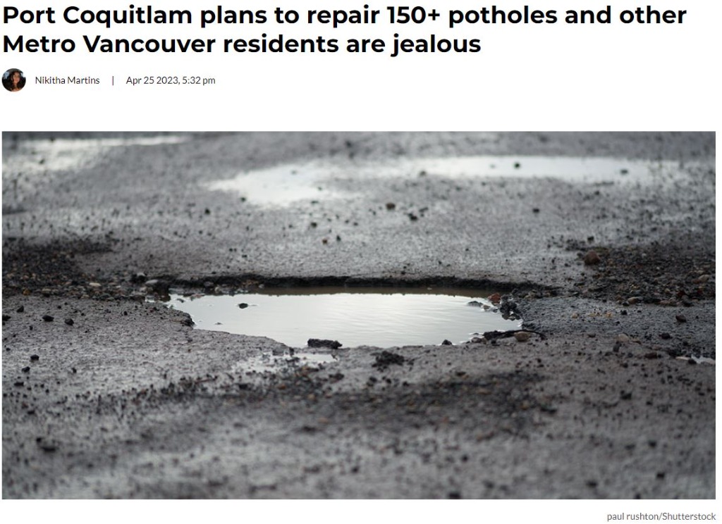 天气刚开始转暖,高贵林港(Port Coquitlam)市长就表示本周将进行为期两天的“修复路坑闪电战”,预计本周过后,高贵林港的道路将变得更加顺畅,市府工作人员将修复发现的所有路坑,计划修复超过150个。