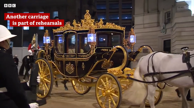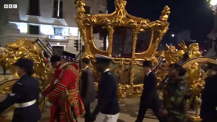 查尔斯三世伉俪,乘坐钻禧纪念马车(Diamond Jubilee State Coach)出发,经过巡礼路线后到达威斯敏斯特教堂。
