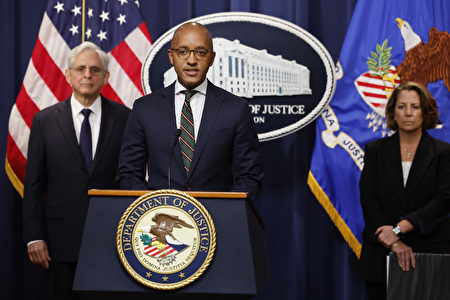 2023年6月23日,美国纽约南区联邦检察官威廉姆斯(Damian Williams,中)与美国司法部长加兰(Merrick Garland)在华盛顿特区召开新闻发布会。(Chip Somodevilla/Getty Images)