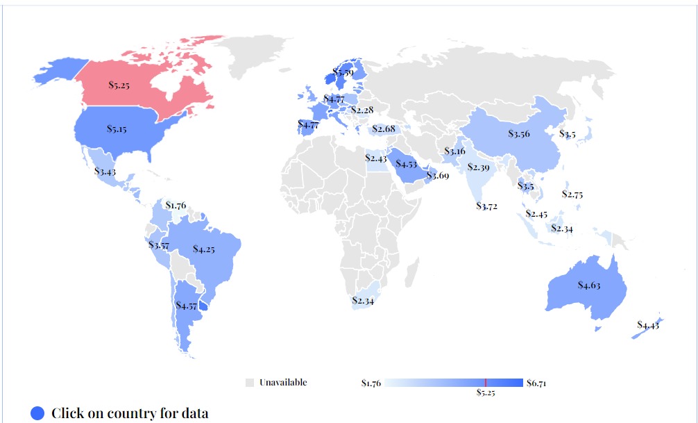 不過,而全球各國的巨無霸的平均價格$4.07,加拿大價格為$5.25。