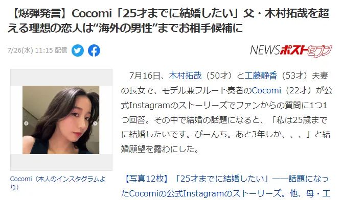 而最近,木村家的大小姐木村心美就因為在ins上回答粉絲問題時,不小心吐露了“恨嫁”的心聲,而在網上壹石激起千層浪
