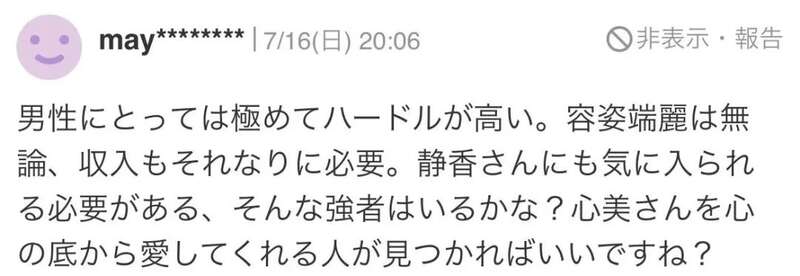對男方來說這個門檻可太高了。首先容貌需要端麗這個不用多說,收入也得要配得上。還需要被岳母靜香認可喜歡,真的有這樣的強者存在麼?希望心美能找到發自心底愛她的人。