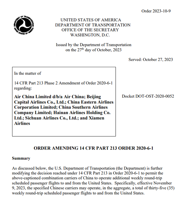 美國交通部發布新命令指出,自2023年11月9日起,指定的中國航空公司每周可運營往返美國的定期客運航班共計35班。涉及航司包括:中國國際航空公司、北京首都航空股份有限公司、東方航空公司有限公司、中國南方航空有限公司、海南航空控股有限公司、肆川航空股份有限公司和廈門航空公司。