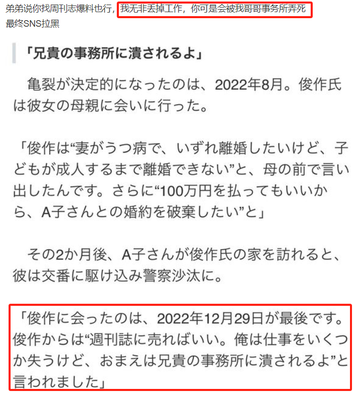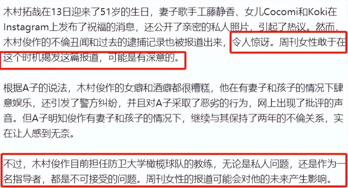 更微妙的是,木村弟弟還特意用木村拓哉的關系威脅了女方,阻攔對方對外爆料,放話表示就算他婚外情曝光,最壞的結果就是丟掉工作,而女方可是會被木村拓哉的經紀公司弄死……