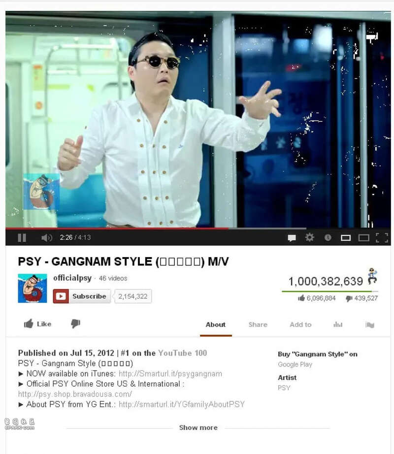 ▎ 2012年12月22日,Psy“鸟叔”的《江南Style》视频点击量,首次突破了十亿大关。这成为YouTube首个点播量突破十亿的视频。该视频也是被最多人标注“Like”的视频。
