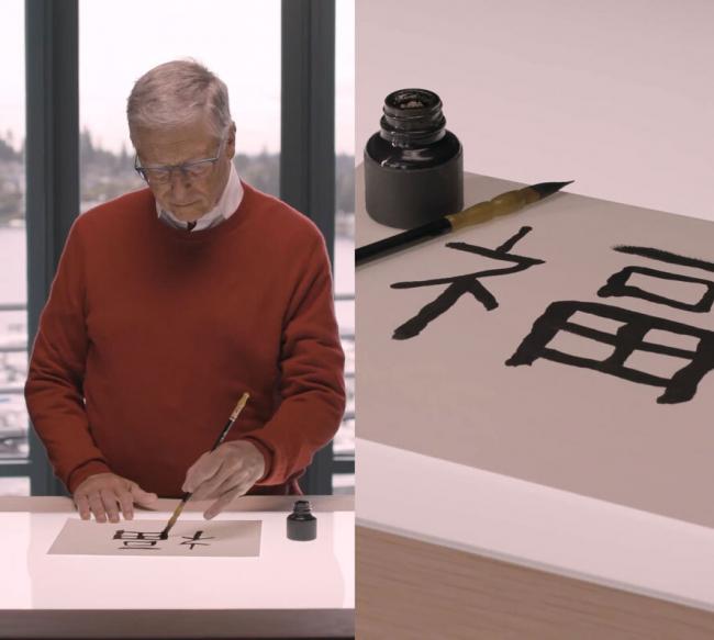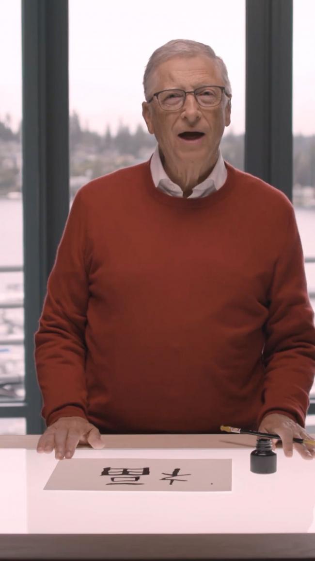 “祝贺大家龙年快乐!我正在练习写汉字福,还是需要进一步加强的,”盖茨在视频旁用英文这样写道。