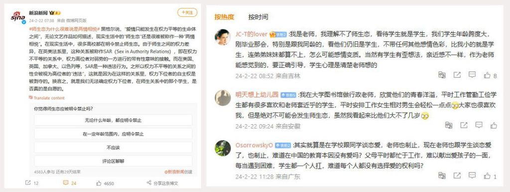 师生恋触动民众道德神经,中国网友一面倒反对老师与学生发展恋情。多数人认为,师生恋会出现权势不对等,未成年学生心智也尚未完全成熟,判断能力恐不足。