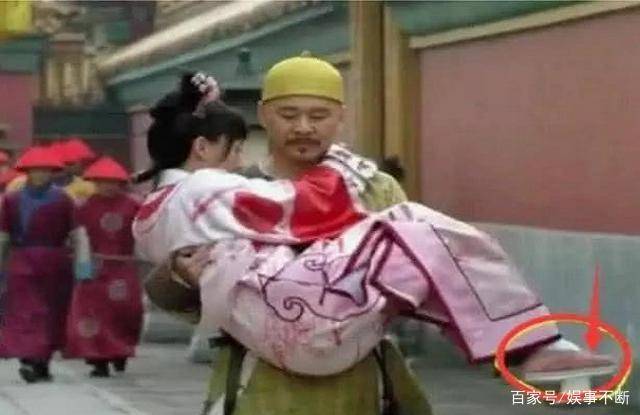 第五个穿帮镜头:《甄嬛传》这部宫廷剧不管是在刚播出的时候还是现在都非常地受欢迎,图中的这一个画面是皇上抱着甄嬛在走路。