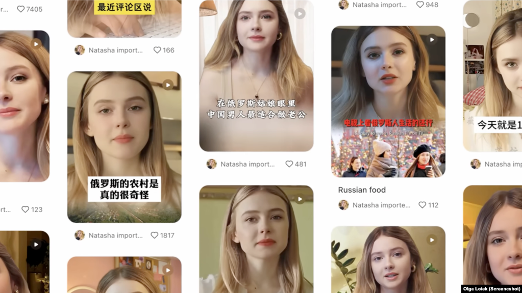 但在中國的社交媒體上,壹群和她長得壹摸壹樣的“分身”們卻自稱是在中國生活多年的俄羅斯人。她們用帶著外國口音的普通話贊美中國以及中俄關系,並表示非常想嫁給中國男人。她們的名字也各不相同,有的叫娜塔莎,有的叫格蕾絲,有的叫安娜……