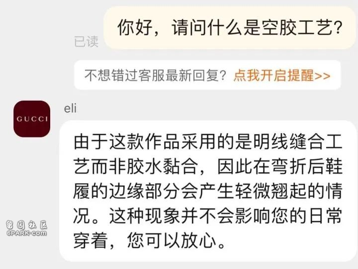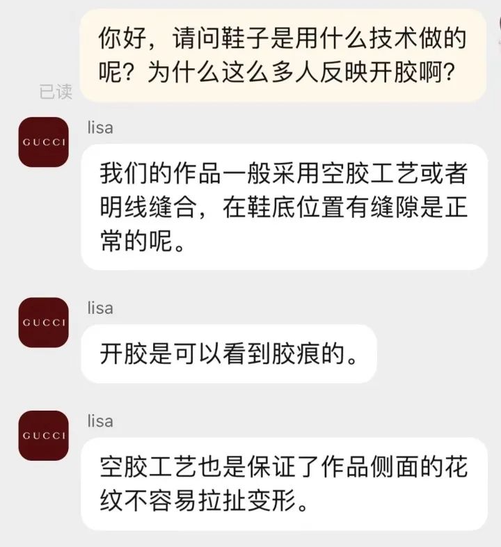 当被问及“鞋子是用什么技术制作?为什么这么多人反映开胶”时,客服回复称:“采用的是空胶工艺或明线缝合,在鞋底位置有缝隙是正常的”“开胶是可以看到胶痕的”“空胶工艺也是保证了作品侧面的花纹不容易拉扯变形”。
