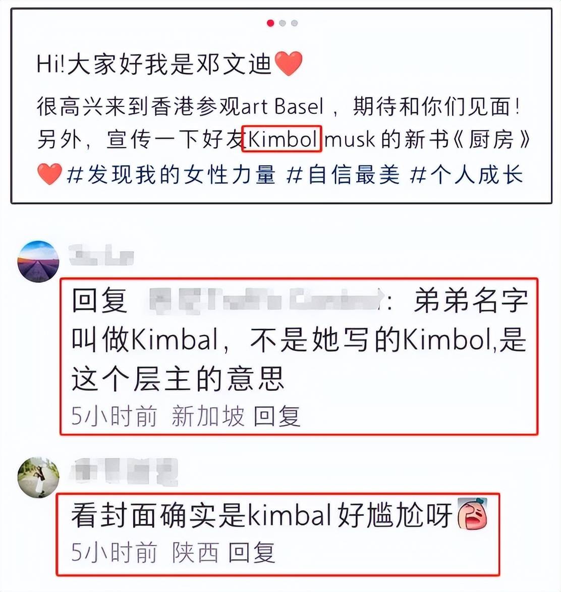 “Kimbal”是马斯克弟弟的名字,邓文迪在第一条动态中为他宣传了新书,敏锐的网友发现,邓文迪的动态文案竟然把“Kimbal”错误拼写成了“Kimbol”。