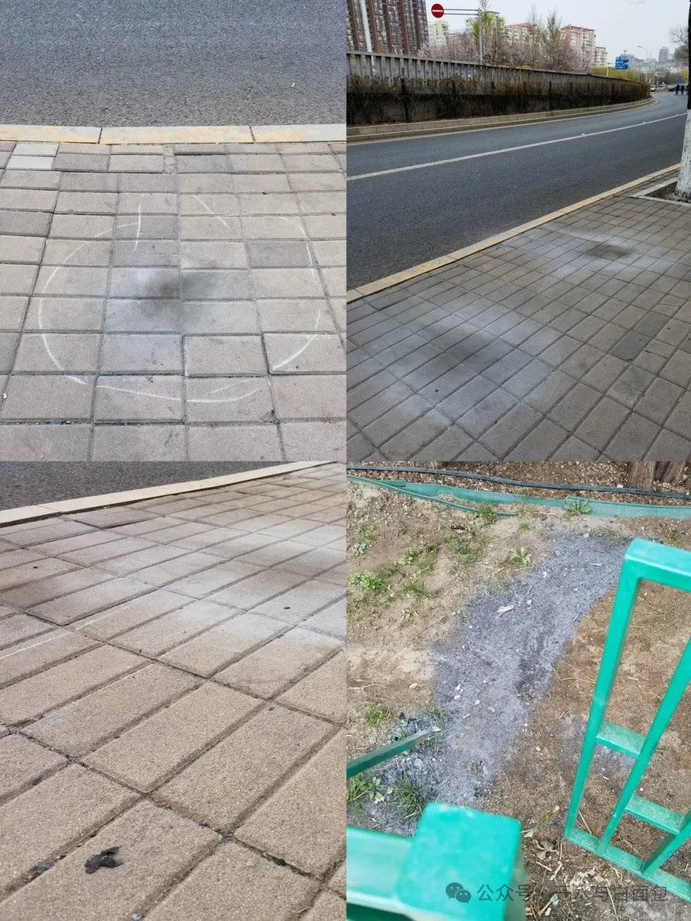 環衛工人已經打掃過了,地面留下了黑黑的印子,還能看見粉筆畫的小圈。