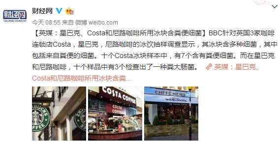 英國常見的叁家咖啡連鎖店星巴克、Costa和Nero(尼路)的冰飲中都被檢測出糞大腸菌群! 英國叁家咖啡品牌 細菌檢測不合格 據BBC報道,這次的便衣調查,目的在於全面掌握這幾家咖啡品牌門店的衛生狀況。 BBC在這叁家品牌下各挑選了10家門店,測試了從食品衛生程度到桌椅窗戶清潔度等壹系列指標。讓調查組震驚的是,這叁家品牌的門店所使用的冰塊中都發現了遠遠超標的糞大腸菌群。 嬀椀洀最崀梔琀琀瀀://mmbiz.qpic.cn/mmbiz_jpg/ajT9KUbORcxwgJYyiaiblRpYZyH8ibfwxrtnZ85iawGJpTWE5HOzYG1Mg6wFzfRrRLZhT9gJG4iadczTPzicEFsCQiczA/640?wx_fmt=jpeg&tp=webp&wxfrom=5&wx_lazy=1[/img]△BBC報道截圖 其中,情況最嚴重的是Costa:在10份Costa冰塊樣品中,有7份被檢測出含有“只有在糞便中才能被找到的污染物細菌”。