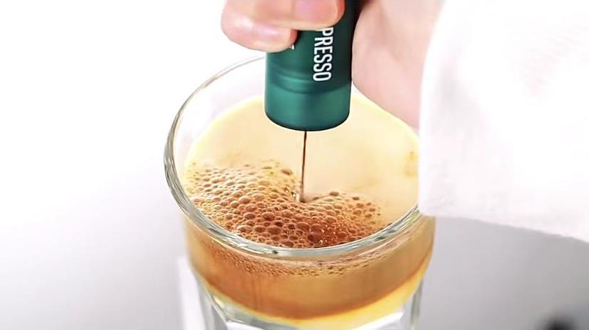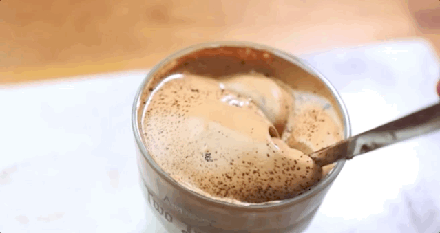 高阶配方,则需要出动打蛋器。往咖啡液里加一勺白糖,用打蛋器把咖啡打得浓稠、表面有轻盈云朵般的泡沫后,将其盖在冰牛奶上即可。由于需要手打400次才能成泡,此特饮又名“400次咖啡”。