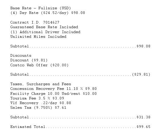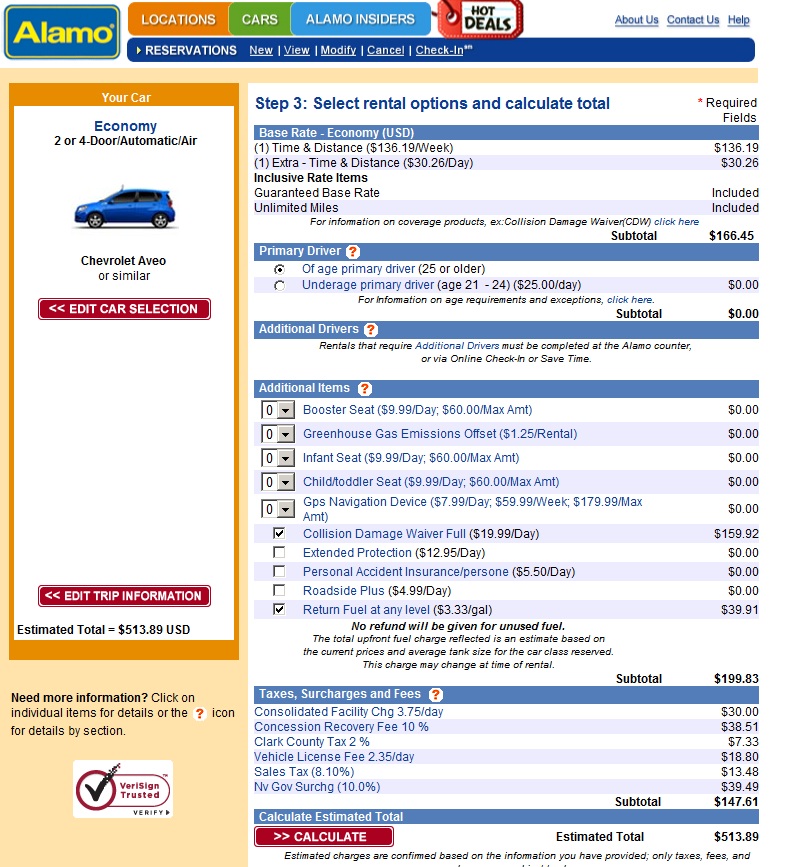 温西不眠人 于 2012-1-05 12:33 写道: 我要在美国呆一个星期,每天要出门,所以想租车。以前没租过。本来想自己开车过去,但是路途遥远,来回要4天,没那个时间和精力。 在一个叫做Alamo 的租车网站查了一下,compact 小车基本价不贵,一个星期才136元。但是不知道为什么其它的乱七八糟的费用加上去以后,一个星期就变成514元了。每天73块钱有多。 这里我帖了租车公司网站的计算清单。请有在美国租车的同学进来指点一下:有没有哪些是必须要买的?哪些是没有必要的? 你们以前在美国租车,最终的成本是大约每天多少钱? 有什么需要注意的吗?请分享。谢谢。 |