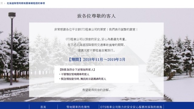 艾am板豬 於 2018-12-28 09:26 寫道: 互聯網 日本OTS租車公司公佈,今年11月到下年3月,不會租車給「不習慣在雪地開車」和「緊急情況發生時,無法用日語溝通」的人。 |