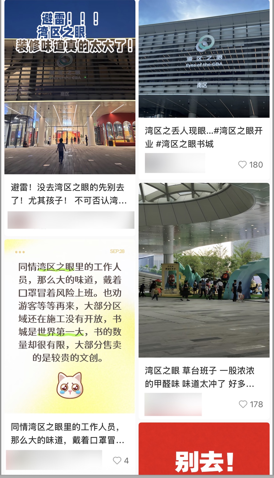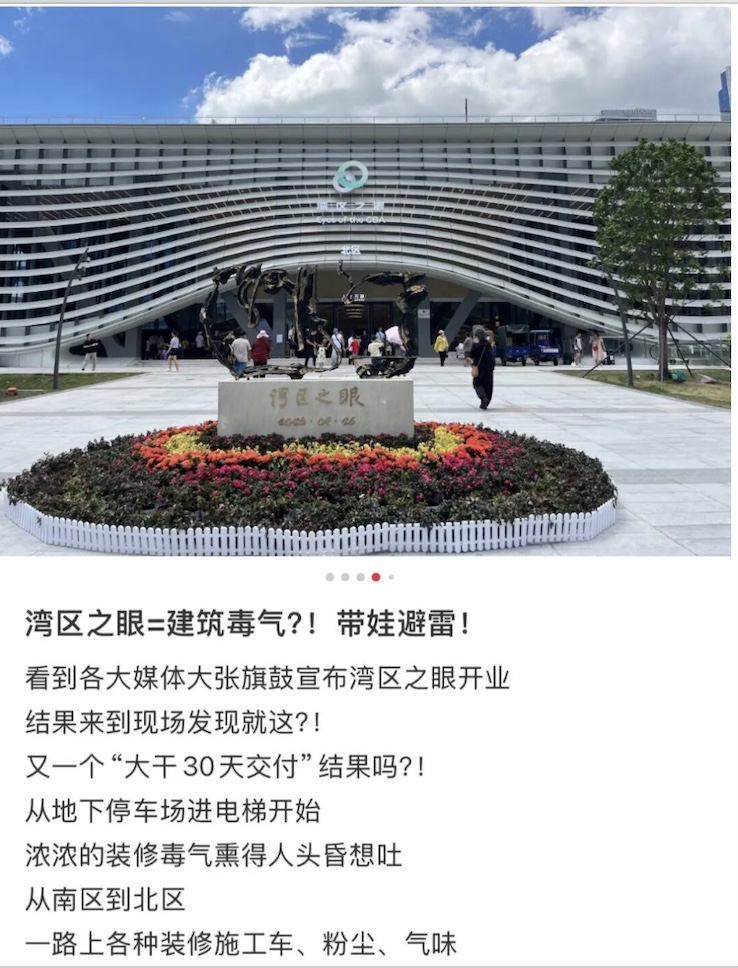 有网友说,“湾区之眼=建筑毒气?带娃避雷,从地下停车场进电梯开始,浓浓的装修毒气熏得人头昏想吐,从南区到北区,一路上各种装修施工车、粉尘、气味”。