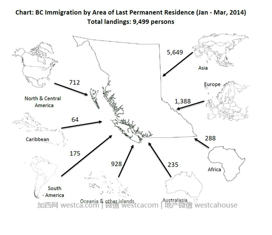 上面两张图表显示了2014年一季度国际移民的构成及落户地区。不难看出,亚裔移民占有较大比例,2006-2011年的统计数据也显示同样结果。中国移民超过20%,而且绝大多数落户温哥华地区,约95%,显示出强烈的偏好。