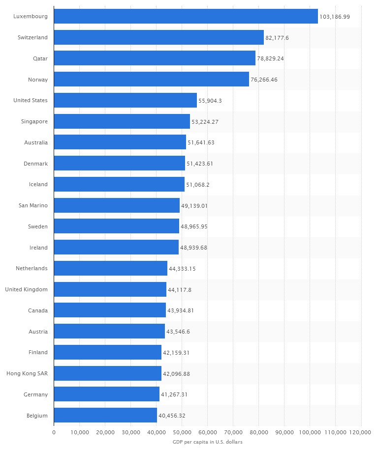 2015年全球最高人均年收入(國內的人均生產總值GDP,以美元計算)的前20個國家,在2015年統計顯示,排名最高的前20個國家的人均年收入(GDP)如下,德國排名第19,人均收入約41,267美元(GDP),加拿大排名第15,人均收入約43,934.81美元(GDP),位於榜首是Luxembourg盧森堡,人均收入約103,186.99美元(GDP)。