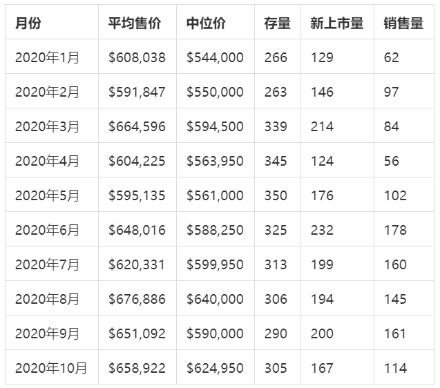 表2:Nanaimo 2020年1月——10月独立屋交易数据