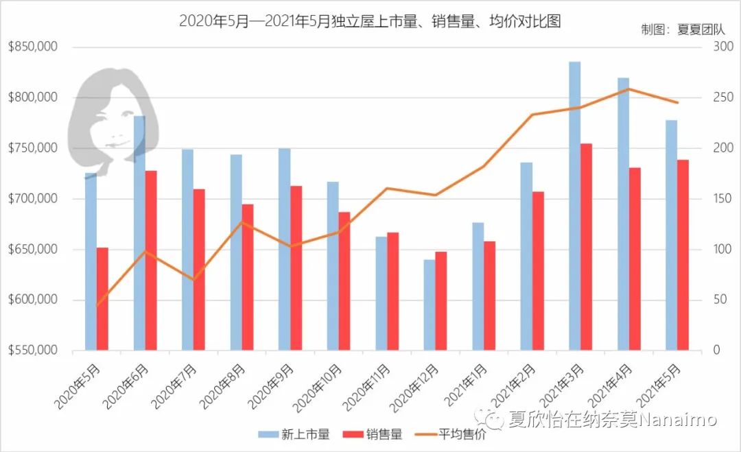 在过去的3个月中(2021年3月-5月),纳奈莫独立屋均价分别为$790,481、$808,509和$795,535,纳奈莫独立屋均价已经在80万加元附近形成了一个价格平台,而去年同一时期,该价格平台仅为60万加元。