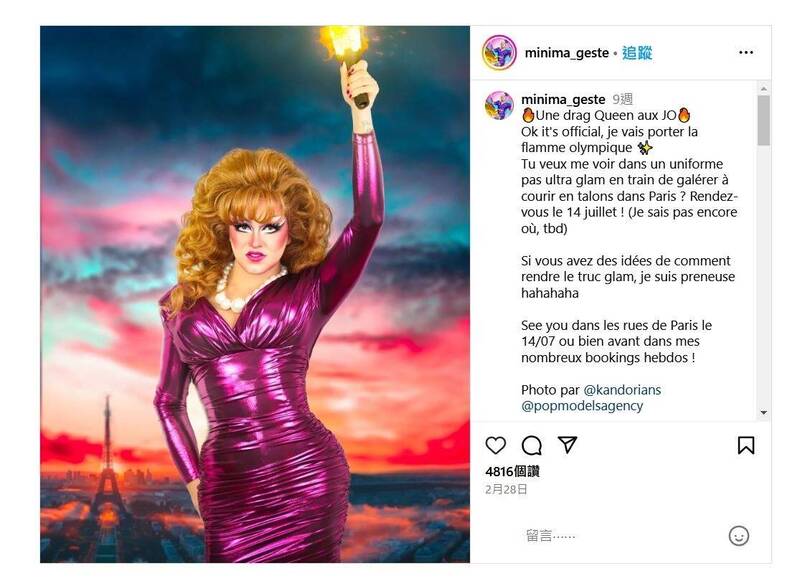 法國變裝皇後稍早在社群媒體上透露,將在巴黎奧運聖火傳遞至法國首都時,擔任其中1名火炬傳遞手。(圖擷取自instagram.com/minima_geste/)