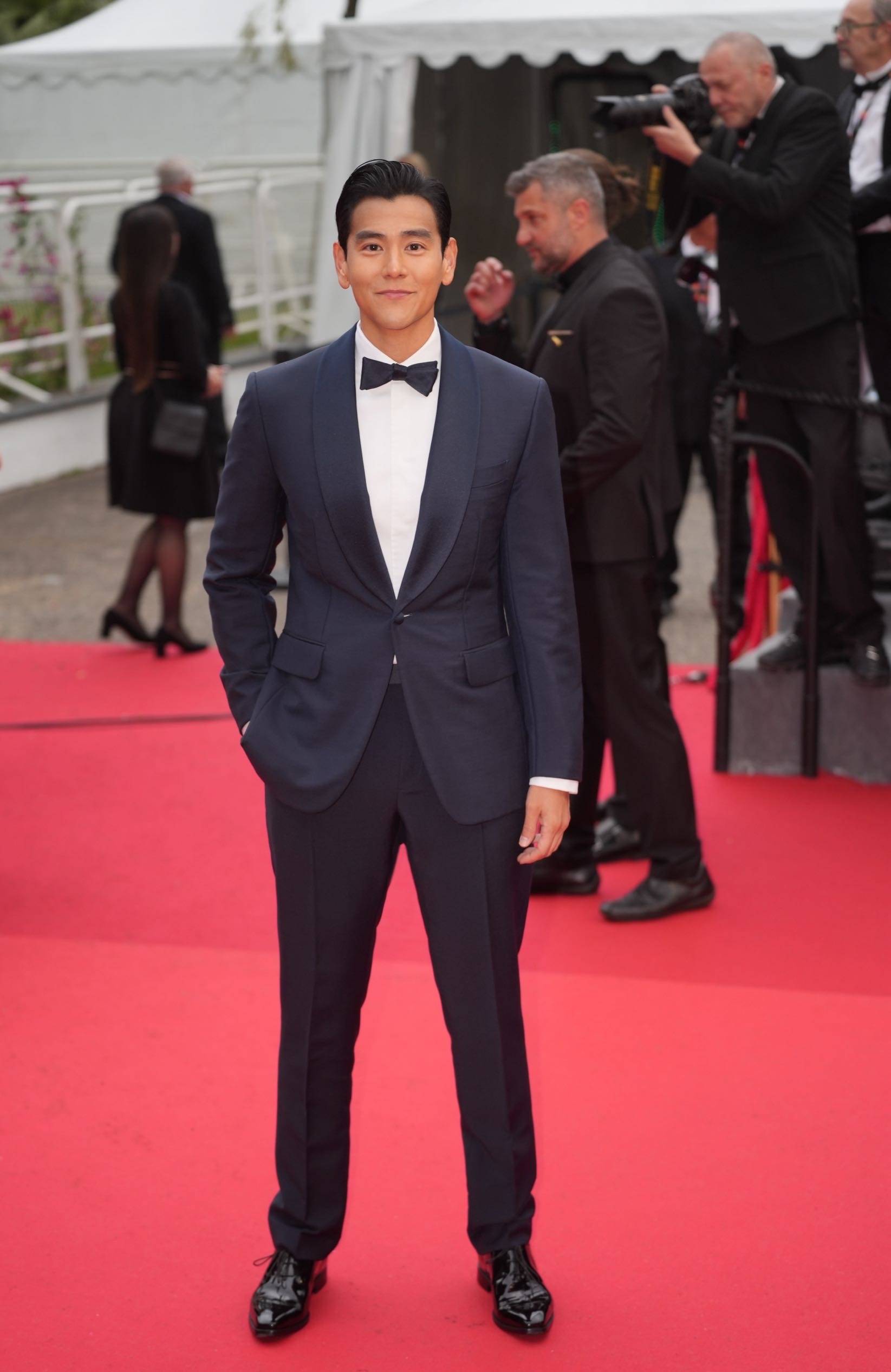 《狗陣》另壹位主演彭於晏也亮相紅毯,壹襲由Berluti巴黎定制工坊打造的深藍色青果領西裝,盡顯優雅紳士品格,皮膚緊致,狀態能打。