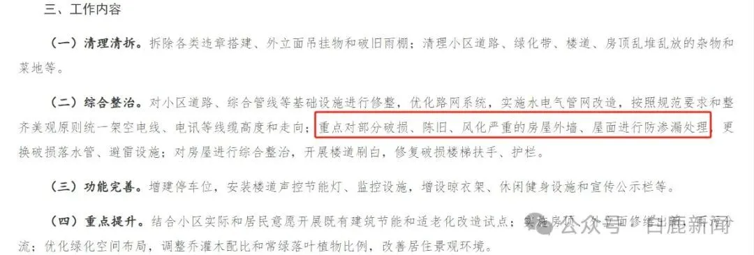 白鹿新聞注意到,《銅陵市老舊小區整治改造工程實施方案》(以下簡稱:《實施方案》)文件中特別提到,“要重點對部分破損、陳舊、風化嚴重的房屋外牆、屋面進行防滲漏處理。”而郊區住建局局長劉劍2023年4月23日也曾在會上提到,老舊小區改造主要是針對小區內的居民樓外牆損壞、屋面滲漏、樓道整治,道路、綠化、污水管網等基礎設施進行改造。