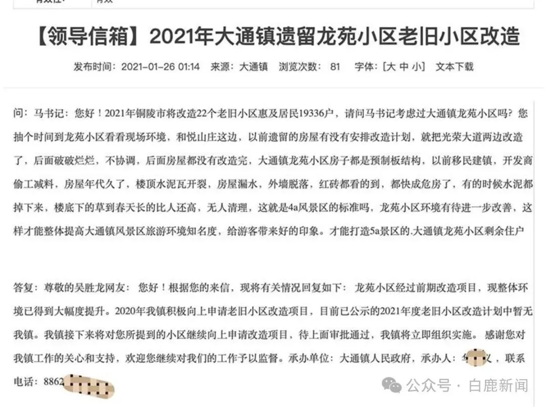 2021年1月25日,龍苑小區居民吳勝龍生前通過安徽銅陵市郊區政府網站“領導郵箱”欄目,向時任區委書記馬軍反映“2021年大通鎮遺留龍苑小區老舊小區改造”後的房子質量問題。