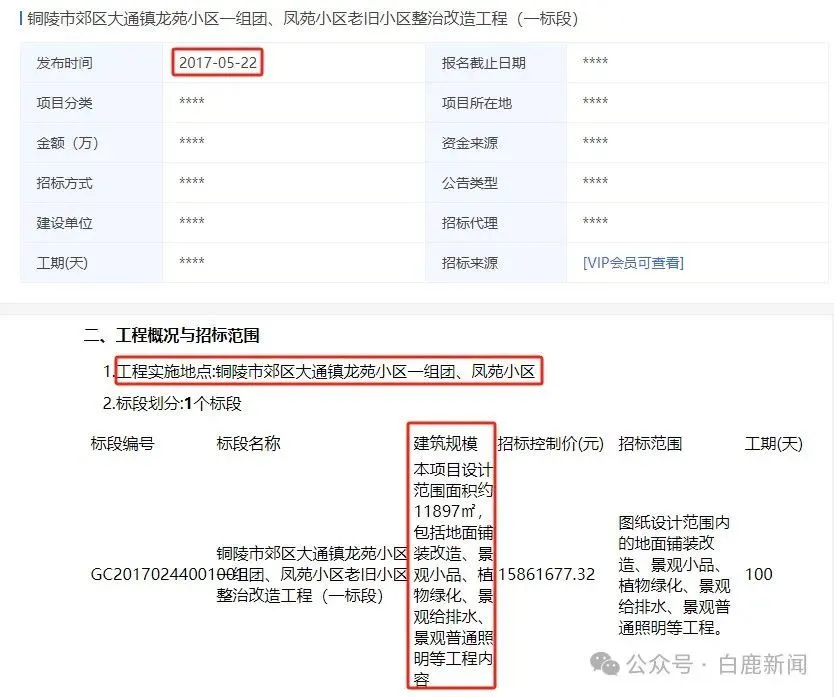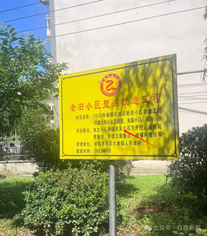 銅陵市2022年5月發布的《銅陵市2022年老舊小區改造實施方案》顯示,該市2022年度共計改造老舊小區31個,包括龍苑小區叁組團等。白鹿新聞注意到,在事發小區的路邊佇立著壹塊由大通鎮人民政府制作的《老舊小區整治改造工程》標牌,上面寫道,2022年銅陵市郊區老舊小區改造工程包含大通龍苑小區叁組團、光榮小區、鳳苑小區,建成時間為2022年9月。改造涉及土石方開挖、道路拓寬整治、外牆立面整治、樓梯間整治等。