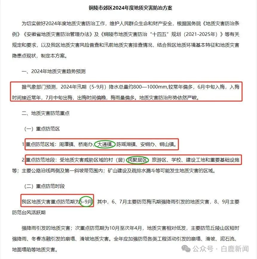 白鹿新聞注意到,早在事發前,銅陵郊區政府依據氣象部門的預測,明確指出了全區地質災害的6個重點防范區域,其中就包括涉事小區在內的大通鎮。可就在郊區政府下發《銅陵市郊區2024年度地質災害防治方案》通知不到壹個月時間,處於重點防范區、重點防范地段內的龍苑小區48棟居民樓還是轟然倒塌了。