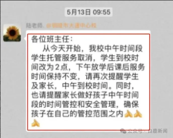 “事發前,林芳在群裡跟她語音電話時,無意中提及了此事。沒想到,壹個小時之後就陰陽兩隔。”據王芳另壹牌友提供的大通中心學校5月13日轉發給各年級班主任的《通知》顯示,“從今天開始,我校中午時間段學生托管服務取消,學生到校時間改為2點,下午放學後課後服務時間保持不變,請再次提醒學生及家長,中午到校時間。”
